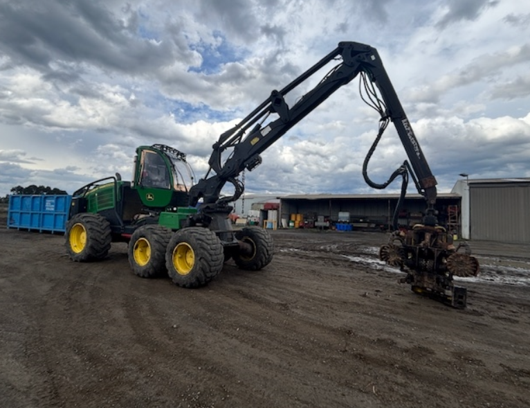 John Deere 1270E 6 Wheeled harvester, equipped with John Deere H415 harvesting head